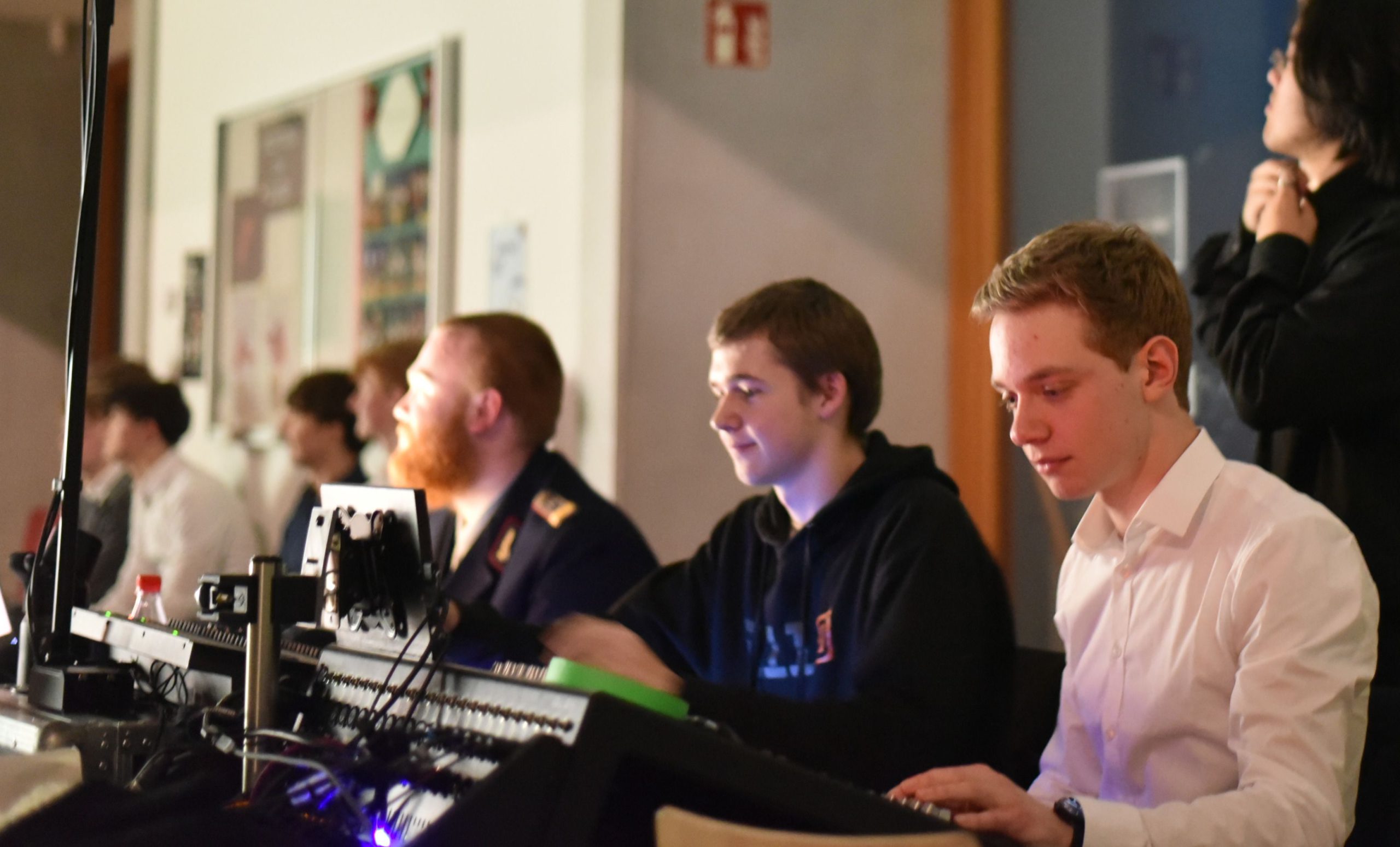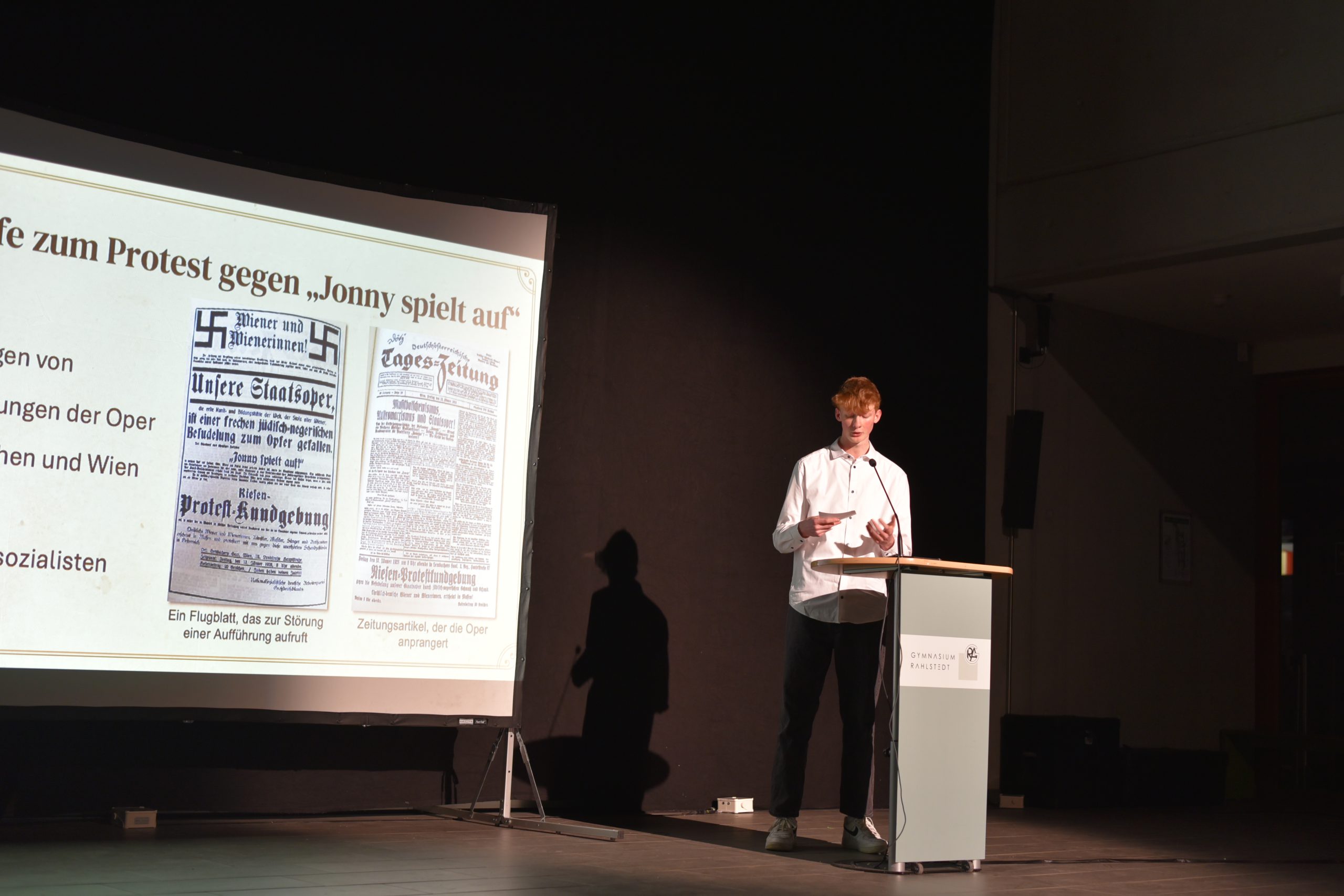 In insgesamt fünf thematischen Abschnitten präsentierten zehn Referentinnen und Referenten die Ergebnisse ihrer Gruppenarbeiten. Vincent und Magnus setzten als Moderatoren pointiert den inhaltlichen Rahmen. Alle anderen waren hinter den Kulissen aktiv und haben zum Beispiel mit künstlicher Intelligenz Werbeplakate gestaltet oder Bilder für die Präsentationen recherchiert. Sebastian und Wilhelm haben in langen Nachtschichten die gesamte Präsentation formatiert, die Musikbeispiele eingefügt und teils mit Untertiteln versehen, damit das Publikum die oftmals politisch brisanten oder humorvollen Texte mitlesen konnte. Als Technikteam des Abends wurden die beiden von Luk aus der 10c unterstützt.