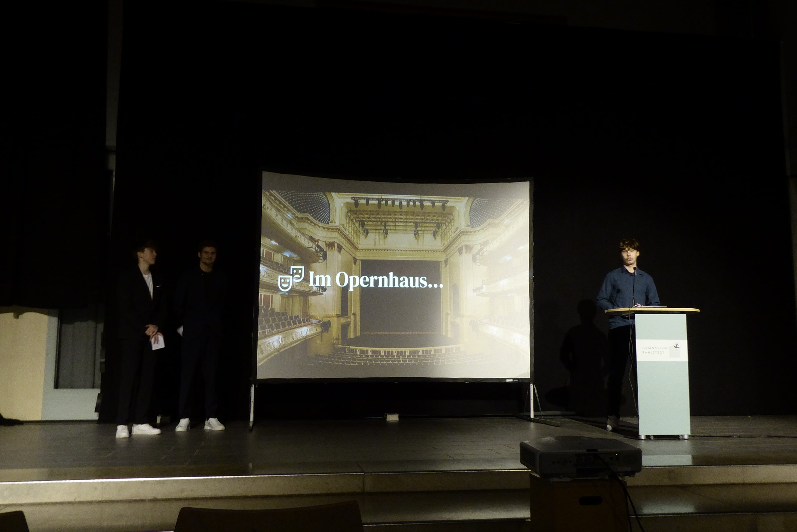 In insgesamt fünf thematischen Abschnitten präsentierten zehn Referentinnen und Referenten die Ergebnisse ihrer Gruppenarbeiten. Vincent und Magnus setzten als Moderatoren pointiert den inhaltlichen Rahmen. Alle anderen waren hinter den Kulissen aktiv und haben zum Beispiel mit künstlicher Intelligenz Werbeplakate gestaltet oder Bilder für die Präsentationen recherchiert. Sebastian und Wilhelm haben in langen Nachtschichten die gesamte Präsentation formatiert, die Musikbeispiele eingefügt und teils mit Untertiteln versehen, damit das Publikum die oftmals politisch brisanten oder humorvollen Texte mitlesen konnte. Als Technikteam des Abends wurden die beiden von Luk aus der 10c unterstützt.