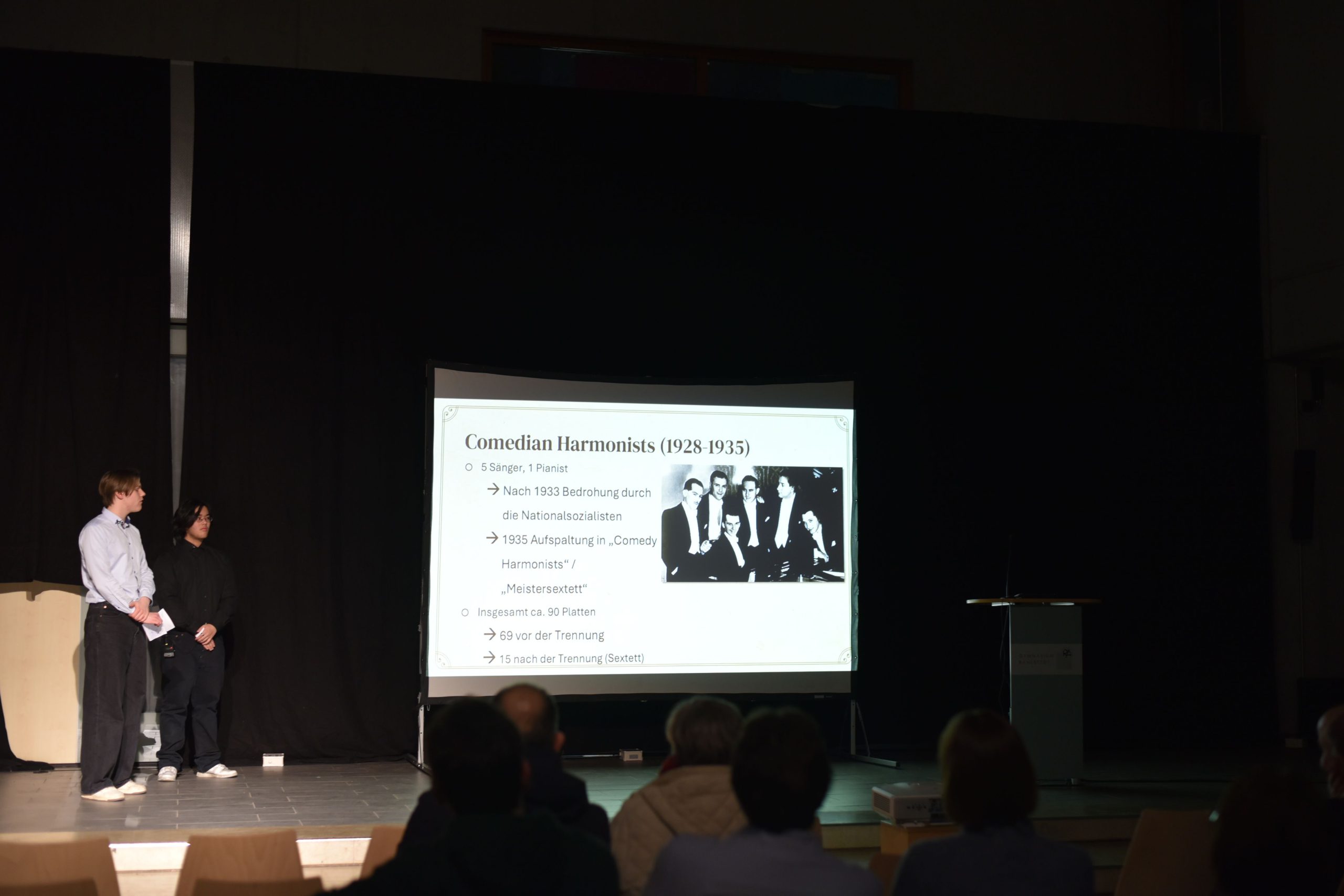 In insgesamt fünf thematischen Abschnitten präsentierten zehn Referentinnen und Referenten die Ergebnisse ihrer Gruppenarbeiten. Vincent und Magnus setzten als Moderatoren pointiert den inhaltlichen Rahmen. Alle anderen waren hinter den Kulissen aktiv und haben zum Beispiel mit künstlicher Intelligenz Werbeplakate gestaltet oder Bilder für die Präsentationen recherchiert. Sebastian und Wilhelm haben in langen Nachtschichten die gesamte Präsentation formatiert, die Musikbeispiele eingefügt und teils mit Untertiteln versehen, damit das Publikum die oftmals politisch brisanten oder humorvollen Texte mitlesen konnte. Als Technikteam des Abends wurden die beiden von Luk aus der 10c unterstützt.