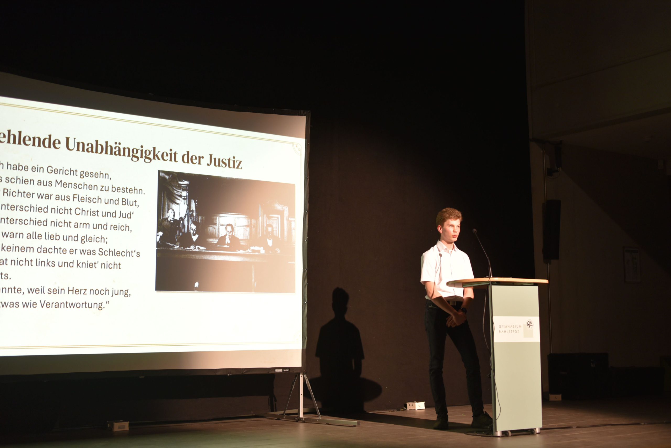 In insgesamt fünf thematischen Abschnitten präsentierten zehn Referentinnen und Referenten die Ergebnisse ihrer Gruppenarbeiten. Vincent und Magnus setzten als Moderatoren pointiert den inhaltlichen Rahmen. Alle anderen waren hinter den Kulissen aktiv und haben zum Beispiel mit künstlicher Intelligenz Werbeplakate gestaltet oder Bilder für die Präsentationen recherchiert. Sebastian und Wilhelm haben in langen Nachtschichten die gesamte Präsentation formatiert, die Musikbeispiele eingefügt und teils mit Untertiteln versehen, damit das Publikum die oftmals politisch brisanten oder humorvollen Texte mitlesen konnte. Als Technikteam des Abends wurden die beiden von Luk aus der 10c unterstützt.