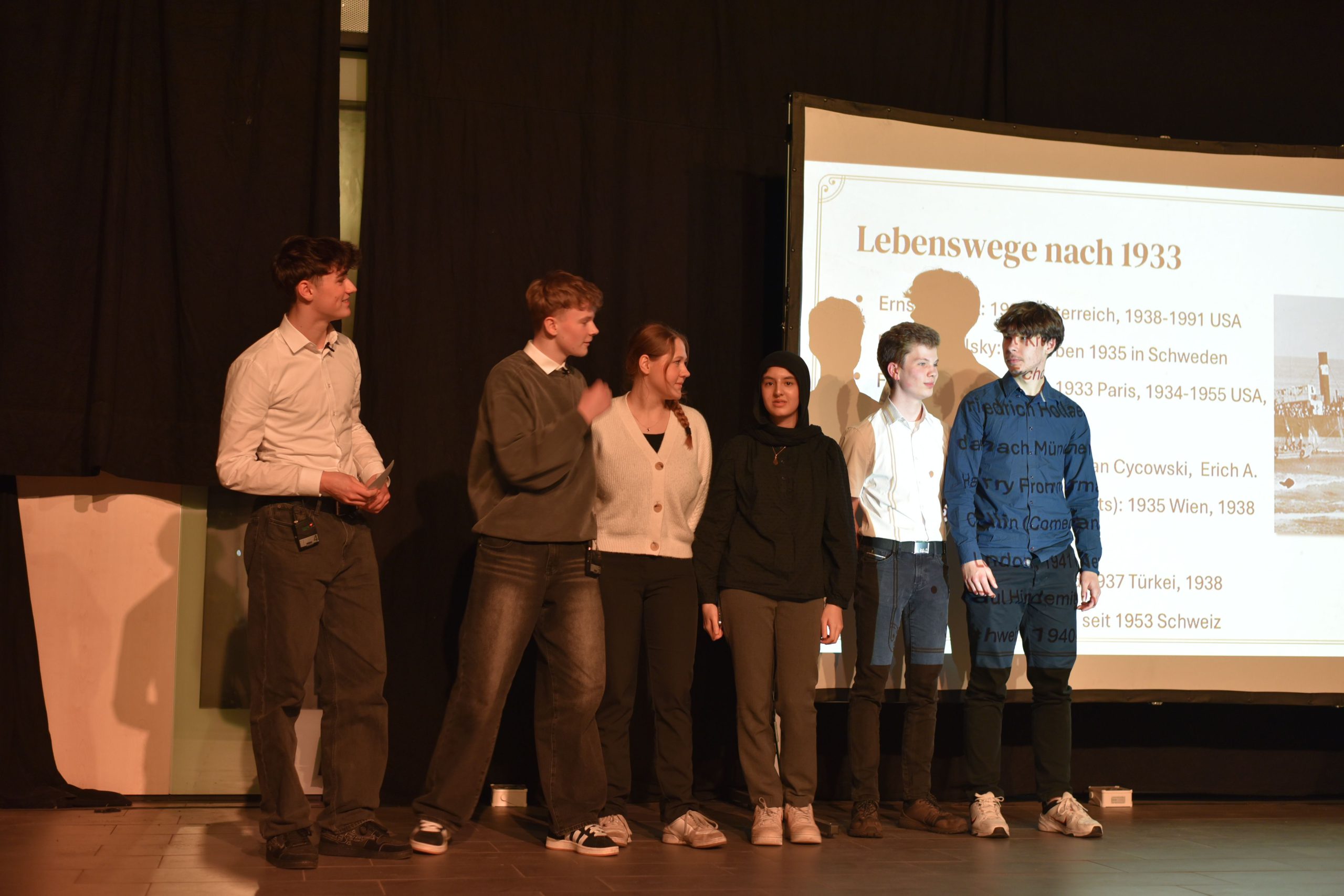 In insgesamt fünf thematischen Abschnitten präsentierten zehn Referentinnen und Referenten die Ergebnisse ihrer Gruppenarbeiten. Vincent und Magnus setzten als Moderatoren pointiert den inhaltlichen Rahmen. Alle anderen waren hinter den Kulissen aktiv und haben zum Beispiel mit künstlicher Intelligenz Werbeplakate gestaltet oder Bilder für die Präsentationen recherchiert. Sebastian und Wilhelm haben in langen Nachtschichten die gesamte Präsentation formatiert, die Musikbeispiele eingefügt und teils mit Untertiteln versehen, damit das Publikum die oftmals politisch brisanten oder humorvollen Texte mitlesen konnte. Als Technikteam des Abends wurden die beiden von Luk aus der 10c unterstützt.