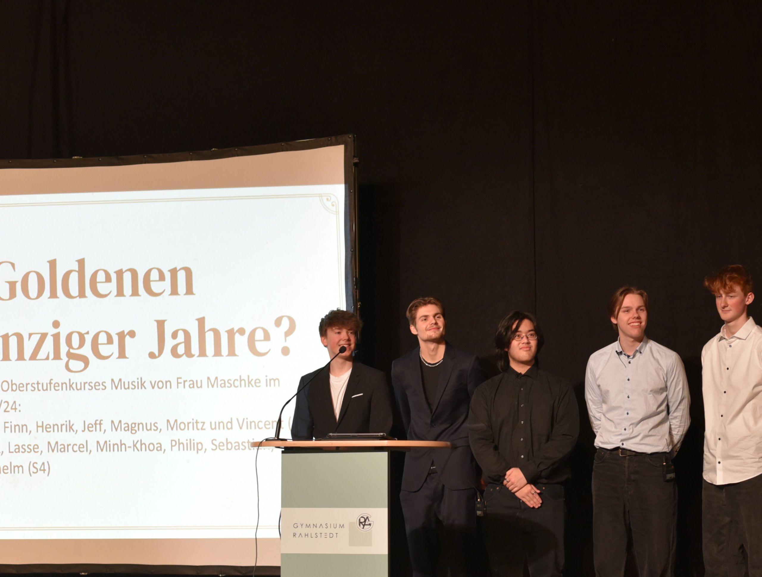 In insgesamt fünf thematischen Abschnitten präsentierten zehn Referentinnen und Referenten die Ergebnisse ihrer Gruppenarbeiten. Vincent und Magnus setzten als Moderatoren pointiert den inhaltlichen Rahmen. Alle anderen waren hinter den Kulissen aktiv und haben zum Beispiel mit künstlicher Intelligenz Werbeplakate gestaltet oder Bilder für die Präsentationen recherchiert. Sebastian und Wilhelm haben in langen Nachtschichten die gesamte Präsentation formatiert, die Musikbeispiele eingefügt und teils mit Untertiteln versehen, damit das Publikum die oftmals politisch brisanten oder humorvollen Texte mitlesen konnte. Als Technikteam des Abends wurden die beiden von Luk aus der 10c unterstützt.
