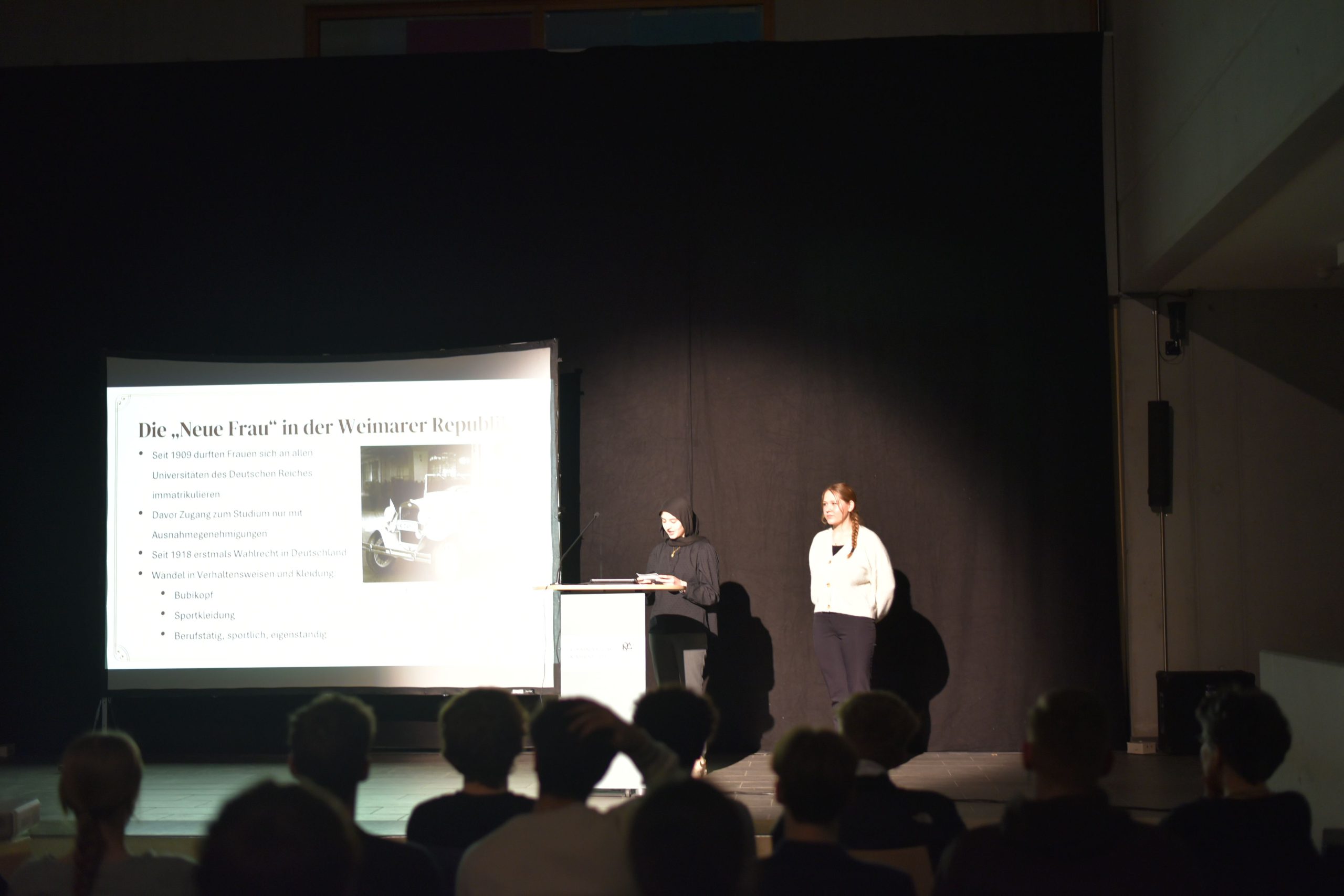 Am 28. Februar 2024 herrschte eine besondere Stimmung im Atrium des GyRa: Charleston-Klänge bei lauschiger Beleuchtung entführten das allmählich eintreffende Publikum in die 1920er Jahre. Durch Serien wie Babylon Berlin ist diese Epoche, auch bekannt als die „Goldenen Zwanziger Jahre“, 100 Jahre später wieder sehr präsent. Doch wie golden waren diese Jahre wirklich? Welche Klischees werden in den Medien darüber vermittelt, und was steckt dahinter?