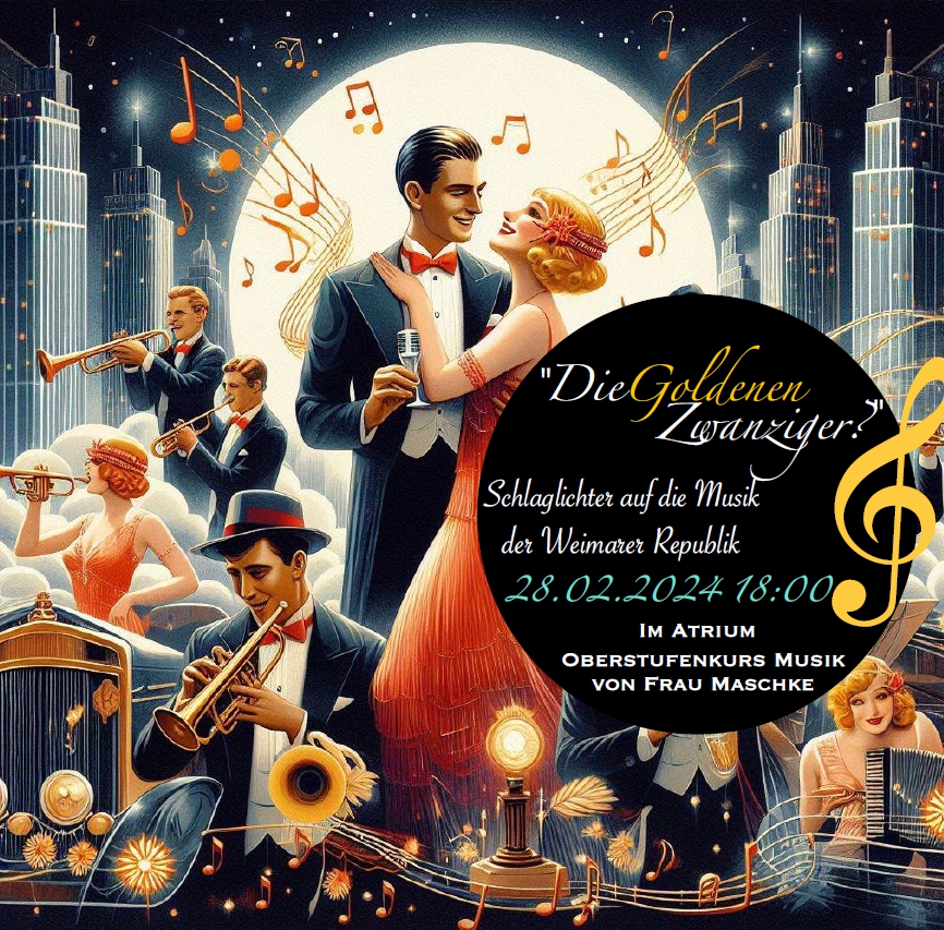 Eine festliche Illustration im Art-Déco-Stil zeigt ein Paar beim Tanzen, umgeben von Musikern mit verschiedenen Instrumenten. Der Hintergrund ist lebhaft mit Noten und stilisierten Gebäuden. Der Text auf dem Bild kündigt eine Veranstaltung mit dem Titel „Die Goldenen Zwanziger“ an, die sich mit der Musik der Weimarer Republik beschäftigt. Datum und Uhrzeit der Veranstaltung sind der 28.02.2024 um 18:00 Uhr, und der Ort ist das Atrium der Oberstufenmusik von Frau Maschke.