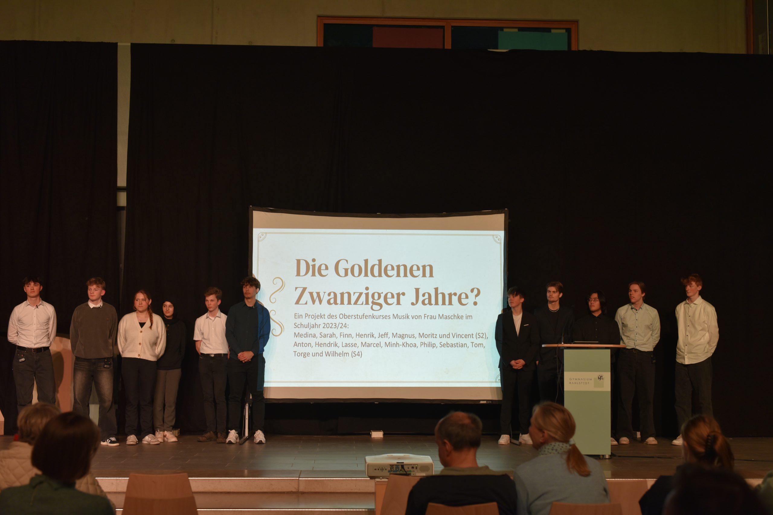 Eine Gruppe von Schülern steht auf einer Bühne vor einem großen Bildschirm. Auf dem Bildschirm ist der Titel "Die Goldenen Zwanziger Jahre?" zu sehen. Im Vordergrund sind einige Zuschauer zu erkennen, die auf die Präsentation achten. Der Hintergrund ist dunkel, was die Aufmerksamkeit auf die Präsentation lenkt.