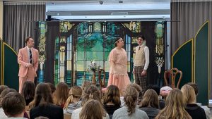 Auch 2026 waren sie wieder zu Gast: die fahrenden Schauspielerinnen und Schauspieler des White Horse Theatre. Im Gepäck hatten sie dieses Mal die Bühnenadaption von „The Great Gatsby“ und verwandelten das Atrium für knapp 90 Minuten in das mondäne Amerika der 1920er Jahre. Mithilfe weniger Accessoires schlüpften die vier native speakers in verschiedene Rollen und forderten die Fantasie der knapp hundert Schülerinnen und Schüler der S4, S2 und des 10. Jahrgangs heraus. Ein gelungener Theatervormittag!