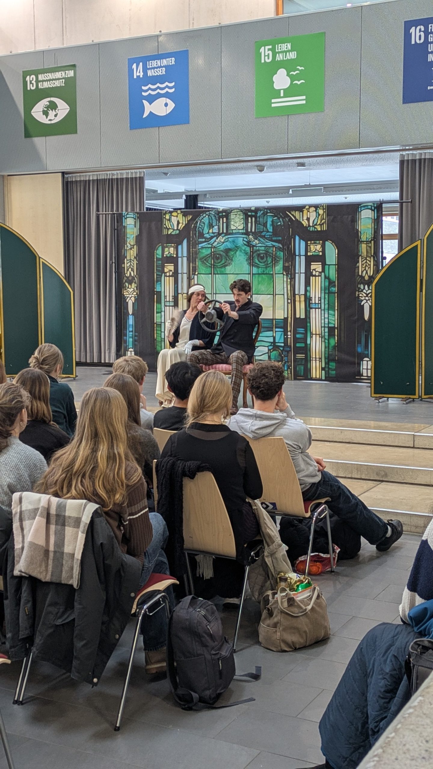 Auch 2026 waren sie wieder zu Gast: die fahrenden Schauspielerinnen und Schauspieler des White Horse Theatre. Im Gepäck hatten sie dieses Mal die Bühnenadaption von „The Great Gatsby“ und verwandelten das Atrium für knapp 90 Minuten in das mondäne Amerika der 1920er Jahre. Mithilfe weniger Accessoires schlüpften die vier native speakers in verschiedene Rollen und forderten die Fantasie der knapp hundert Schülerinnen und Schüler der S4, S2 und des 10. Jahrgangs heraus. Ein gelungener Theatervormittag!