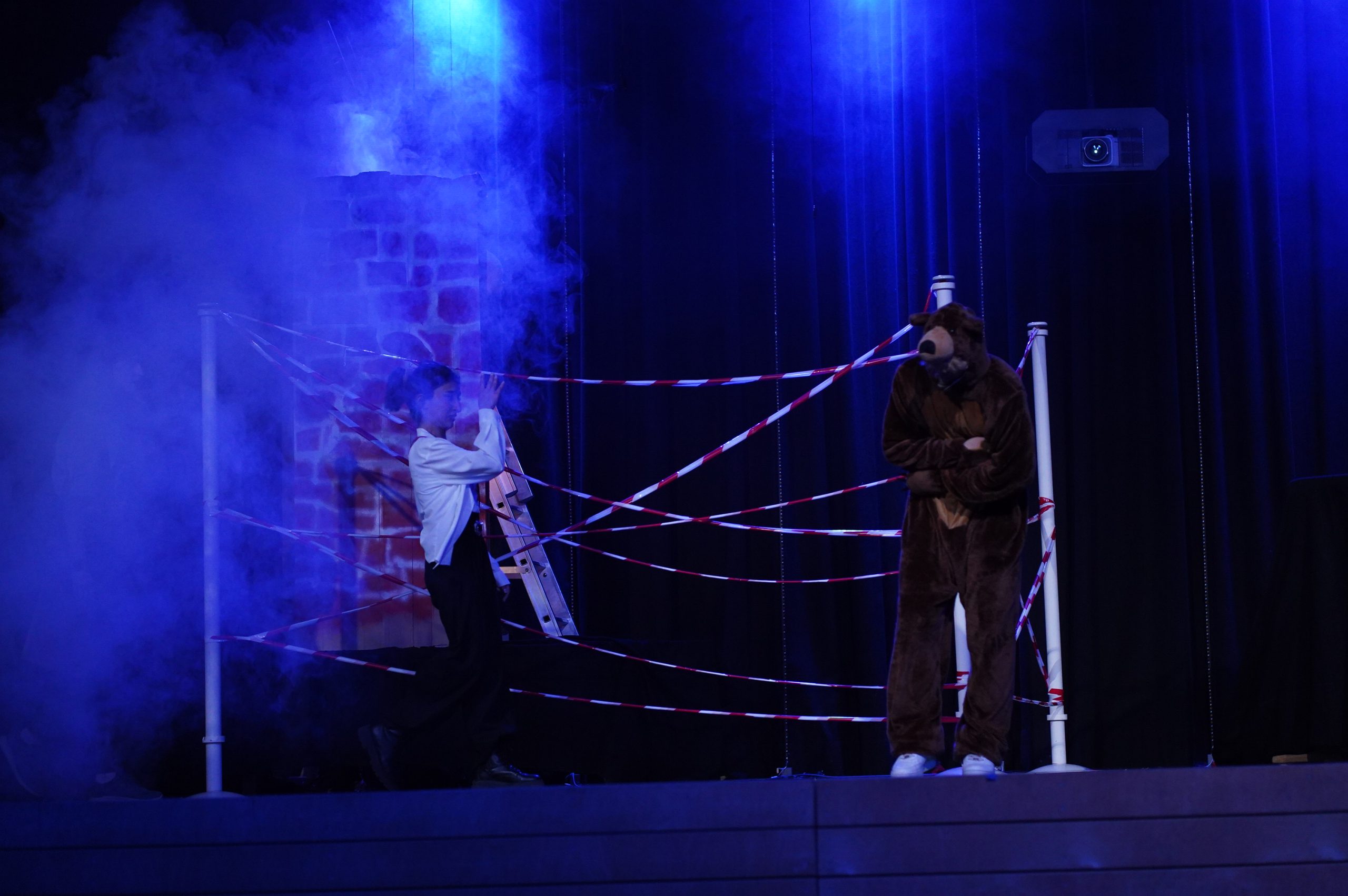 Nachfolgend ein paar Eindrücke der ersten Aufführung am Mittwoch.Fünf Personen auf einer Bühne in einem Theaterszenario, umgeben von blauen Lichtern. Eine Person trägt ein pinkes Outfit, während die anderen schwarze Kleidung tragen. Im Hintergrund steht eine Leiter und einige Requisiten sind sichtbar. Eine Bühnenaufführung mit mehreren Schauspielern. Im Vordergrund sitzt eine Person, während eine andere Person in einem pinken Shirt auf der Bühne nach links läuft. Im Hintergrund stehen drei weitere Schauspieler, die in weißen Hemden gekleidet sind. Die Bühne ist von bunten Lichtern beleuchtet, die eine dramatische Atmosphäre schaffen. Zwei Musiker auf einer Bühne in einem schwach beleuchteten Raum. Ein Mann spielt Klavier, während ein anderer Mann im Hintergrund E-Bass spielt. Beide tragen helle Kleidung. Ein Stuhl steht neben dem Klavier. Zwei Schauspieler auf einer Bühne in einem Theaterstück. Der erste Schauspieler trägt eine schwarze T-Shirt, rote Shorts und hat eine auffällige Frisur sowie Tierohren. Der zweite Schauspieler ist in einem schwarzen Outfit gekleidet und steht entspannt neben ihm. Im Hintergrund sind grüne Lichter und eine Kulisse mit einem steinernen Element zu sehen. Eine Absperrung aus roten und weißen Streifen ist ebenfalls im Bild. Eine Theateraufführung mit fünf Personen auf der Bühne. Zwei Darsteller tragen orangefarbene Tierkostüme, während die anderen in weißen Hemden mit roten Hosenträgern gekleidet sind. Die Szene spielt vor einem grünen Hintergrund mit Beleuchtungseffekten. Die Schauspieler interagieren miteinander, einige scheinen in ein Gespräch vertieft zu sein. Im Hintergrund sind Requisiten und ein Tisch zu sehen. Bühnenbild einer Theateraufführung mit zwei Schauspielerinnen, die auf einer erhöhten Plattform sitzen und ein Buch lesen, während ein weiterer Schauspieler im Vordergrund auf dem Boden liegt. Die Szenerie ist in blaues Licht getaucht. Vier junge Erwachsene sitzen auf einer steinernen Plattform auf einer Bühne, umgeben von blauen Lichtern. Zwei Personen sitzen oben, während zwei unten auf der Plattform platziert sind. Alle tragen ähnliche Kleidung, die aus weißen Hemden und schwarzen Hosen besteht. Die Szene vermittelt eine theatralische Atmosphäre. Zwei Personen auf einer Bühne in einem schwach beleuchteten Raum mit blauen Lichtern und Nebel. Eine Person trägt einen weißen Anzug und hält ein Kettensäge-ähnliches Gerät, während die andere Person in einem braunen Kostüm steht. Um sie herum sind Absperrbänder gespannt. Auf der Bühne stehen zwei Schauspieler. Der erste trägt ein braunes Tierkostüm und hat eine freundliche Ausstrahlung. Der zweite Schauspieler ist in einem pinken Outfit gekleidet. Sie stehen sich gegenüber, während Bühnenlichter und eine dunkle Kulisse mit Sternen im Hintergrund eine lebendige Atmosphäre schaffen. Zwei Schauspieler sitzen auf einer Bühne. Ein Darsteller trägt ein braunes Kostüm, das einem Tier ähnelt, während die andere Person in einem rosa Oberteil und schwarzen Leggings gekleidet ist. Im Hintergrund ist eine dunkle Bühnenkulisse mit blauen Lichtern und einer erhöhten Fläche zu sehen.