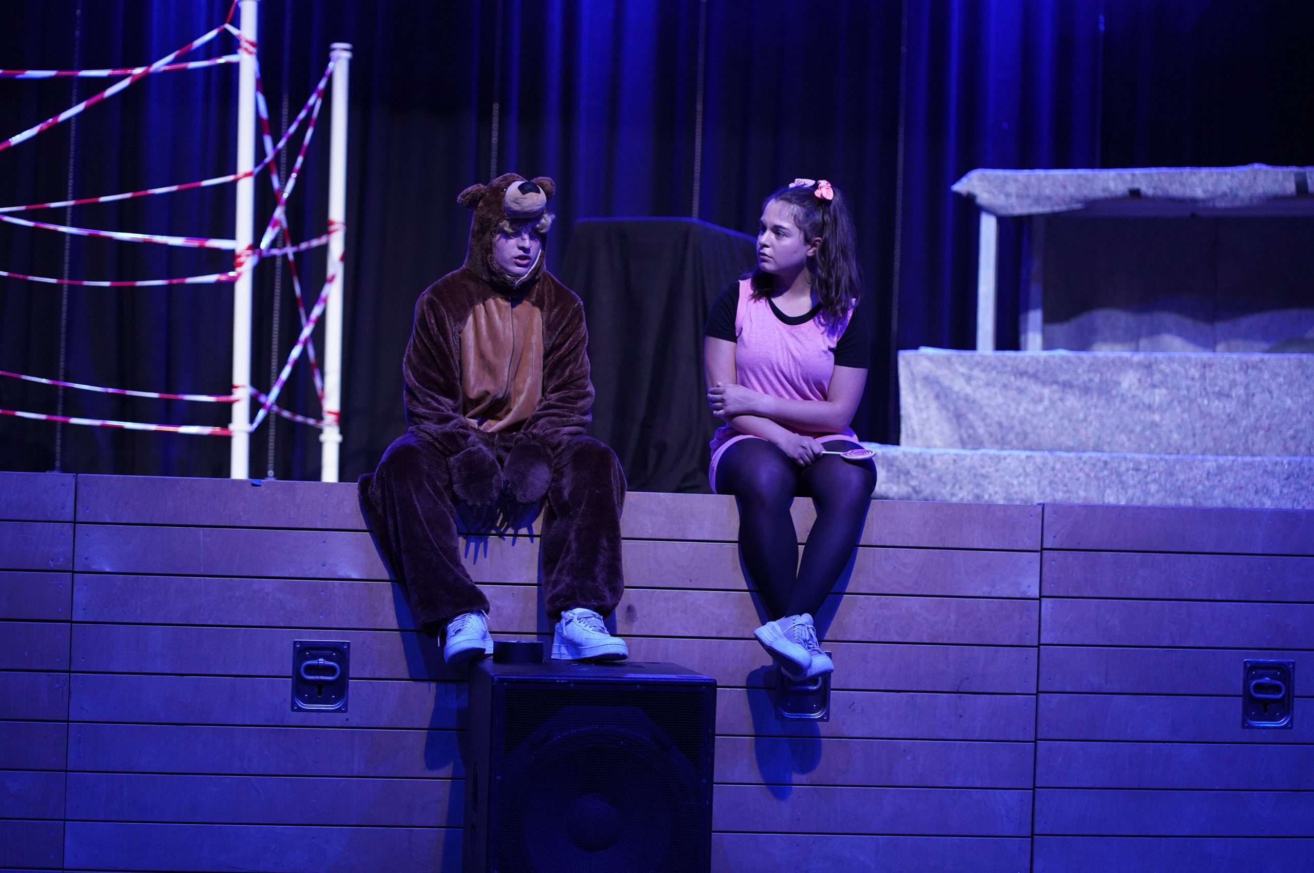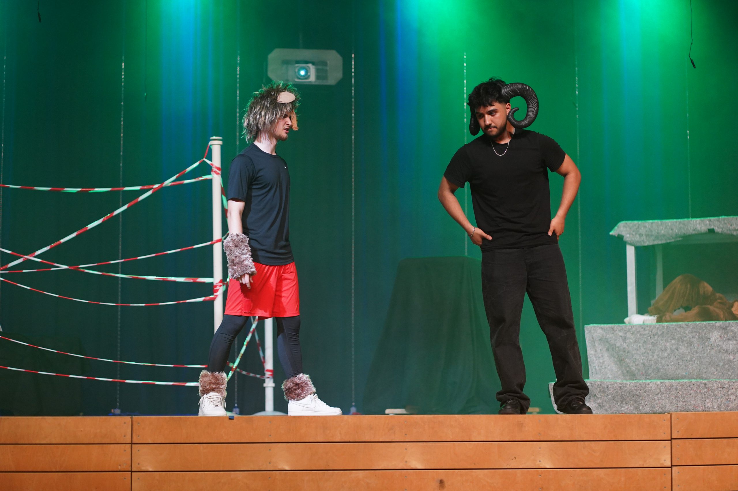 Nachfolgend ein paar Eindrücke der ersten Aufführung am Mittwoch.Fünf Personen auf einer Bühne in einem Theaterszenario, umgeben von blauen Lichtern. Eine Person trägt ein pinkes Outfit, während die anderen schwarze Kleidung tragen. Im Hintergrund steht eine Leiter und einige Requisiten sind sichtbar. Eine Bühnenaufführung mit mehreren Schauspielern. Im Vordergrund sitzt eine Person, während eine andere Person in einem pinken Shirt auf der Bühne nach links läuft. Im Hintergrund stehen drei weitere Schauspieler, die in weißen Hemden gekleidet sind. Die Bühne ist von bunten Lichtern beleuchtet, die eine dramatische Atmosphäre schaffen. Zwei Musiker auf einer Bühne in einem schwach beleuchteten Raum. Ein Mann spielt Klavier, während ein anderer Mann im Hintergrund E-Bass spielt. Beide tragen helle Kleidung. Ein Stuhl steht neben dem Klavier. Zwei Schauspieler auf einer Bühne in einem Theaterstück. Der erste Schauspieler trägt eine schwarze T-Shirt, rote Shorts und hat eine auffällige Frisur sowie Tierohren. Der zweite Schauspieler ist in einem schwarzen Outfit gekleidet und steht entspannt neben ihm. Im Hintergrund sind grüne Lichter und eine Kulisse mit einem steinernen Element zu sehen. Eine Absperrung aus roten und weißen Streifen ist ebenfalls im Bild. Eine Theateraufführung mit fünf Personen auf der Bühne. Zwei Darsteller tragen orangefarbene Tierkostüme, während die anderen in weißen Hemden mit roten Hosenträgern gekleidet sind. Die Szene spielt vor einem grünen Hintergrund mit Beleuchtungseffekten. Die Schauspieler interagieren miteinander, einige scheinen in ein Gespräch vertieft zu sein. Im Hintergrund sind Requisiten und ein Tisch zu sehen. Bühnenbild einer Theateraufführung mit zwei Schauspielerinnen, die auf einer erhöhten Plattform sitzen und ein Buch lesen, während ein weiterer Schauspieler im Vordergrund auf dem Boden liegt. Die Szenerie ist in blaues Licht getaucht. Vier junge Erwachsene sitzen auf einer steinernen Plattform auf einer Bühne, umgeben von blauen Lichtern. Zwei Personen sitzen oben, während zwei unten auf der Plattform platziert sind. Alle tragen ähnliche Kleidung, die aus weißen Hemden und schwarzen Hosen besteht. Die Szene vermittelt eine theatralische Atmosphäre. Zwei Personen auf einer Bühne in einem schwach beleuchteten Raum mit blauen Lichtern und Nebel. Eine Person trägt einen weißen Anzug und hält ein Kettensäge-ähnliches Gerät, während die andere Person in einem braunen Kostüm steht. Um sie herum sind Absperrbänder gespannt. Auf der Bühne stehen zwei Schauspieler. Der erste trägt ein braunes Tierkostüm und hat eine freundliche Ausstrahlung. Der zweite Schauspieler ist in einem pinken Outfit gekleidet. Sie stehen sich gegenüber, während Bühnenlichter und eine dunkle Kulisse mit Sternen im Hintergrund eine lebendige Atmosphäre schaffen. Zwei Schauspieler sitzen auf einer Bühne. Ein Darsteller trägt ein braunes Kostüm, das einem Tier ähnelt, während die andere Person in einem rosa Oberteil und schwarzen Leggings gekleidet ist. Im Hintergrund ist eine dunkle Bühnenkulisse mit blauen Lichtern und einer erhöhten Fläche zu sehen.