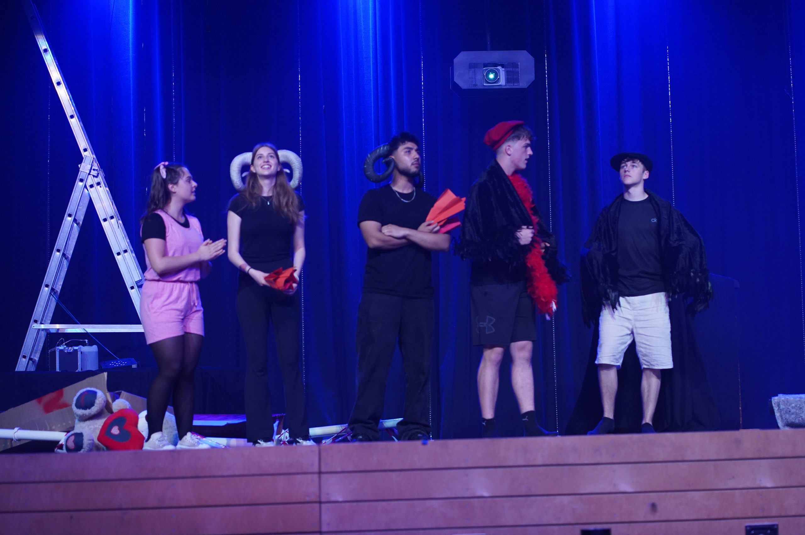 Nachfolgend ein paar Eindrücke der ersten Aufführung am Mittwoch.Fünf Personen auf einer Bühne in einem Theaterszenario, umgeben von blauen Lichtern. Eine Person trägt ein pinkes Outfit, während die anderen schwarze Kleidung tragen. Im Hintergrund steht eine Leiter und einige Requisiten sind sichtbar. Eine Bühnenaufführung mit mehreren Schauspielern. Im Vordergrund sitzt eine Person, während eine andere Person in einem pinken Shirt auf der Bühne nach links läuft. Im Hintergrund stehen drei weitere Schauspieler, die in weißen Hemden gekleidet sind. Die Bühne ist von bunten Lichtern beleuchtet, die eine dramatische Atmosphäre schaffen. Zwei Musiker auf einer Bühne in einem schwach beleuchteten Raum. Ein Mann spielt Klavier, während ein anderer Mann im Hintergrund E-Bass spielt. Beide tragen helle Kleidung. Ein Stuhl steht neben dem Klavier. Zwei Schauspieler auf einer Bühne in einem Theaterstück. Der erste Schauspieler trägt eine schwarze T-Shirt, rote Shorts und hat eine auffällige Frisur sowie Tierohren. Der zweite Schauspieler ist in einem schwarzen Outfit gekleidet und steht entspannt neben ihm. Im Hintergrund sind grüne Lichter und eine Kulisse mit einem steinernen Element zu sehen. Eine Absperrung aus roten und weißen Streifen ist ebenfalls im Bild. Eine Theateraufführung mit fünf Personen auf der Bühne. Zwei Darsteller tragen orangefarbene Tierkostüme, während die anderen in weißen Hemden mit roten Hosenträgern gekleidet sind. Die Szene spielt vor einem grünen Hintergrund mit Beleuchtungseffekten. Die Schauspieler interagieren miteinander, einige scheinen in ein Gespräch vertieft zu sein. Im Hintergrund sind Requisiten und ein Tisch zu sehen. Bühnenbild einer Theateraufführung mit zwei Schauspielerinnen, die auf einer erhöhten Plattform sitzen und ein Buch lesen, während ein weiterer Schauspieler im Vordergrund auf dem Boden liegt. Die Szenerie ist in blaues Licht getaucht. Vier junge Erwachsene sitzen auf einer steinernen Plattform auf einer Bühne, umgeben von blauen Lichtern. Zwei Personen sitzen oben, während zwei unten auf der Plattform platziert sind. Alle tragen ähnliche Kleidung, die aus weißen Hemden und schwarzen Hosen besteht. Die Szene vermittelt eine theatralische Atmosphäre. Zwei Personen auf einer Bühne in einem schwach beleuchteten Raum mit blauen Lichtern und Nebel. Eine Person trägt einen weißen Anzug und hält ein Kettensäge-ähnliches Gerät, während die andere Person in einem braunen Kostüm steht. Um sie herum sind Absperrbänder gespannt. Auf der Bühne stehen zwei Schauspieler. Der erste trägt ein braunes Tierkostüm und hat eine freundliche Ausstrahlung. Der zweite Schauspieler ist in einem pinken Outfit gekleidet. Sie stehen sich gegenüber, während Bühnenlichter und eine dunkle Kulisse mit Sternen im Hintergrund eine lebendige Atmosphäre schaffen. Zwei Schauspieler sitzen auf einer Bühne. Ein Darsteller trägt ein braunes Kostüm, das einem Tier ähnelt, während die andere Person in einem rosa Oberteil und schwarzen Leggings gekleidet ist. Im Hintergrund ist eine dunkle Bühnenkulisse mit blauen Lichtern und einer erhöhten Fläche zu sehen.
