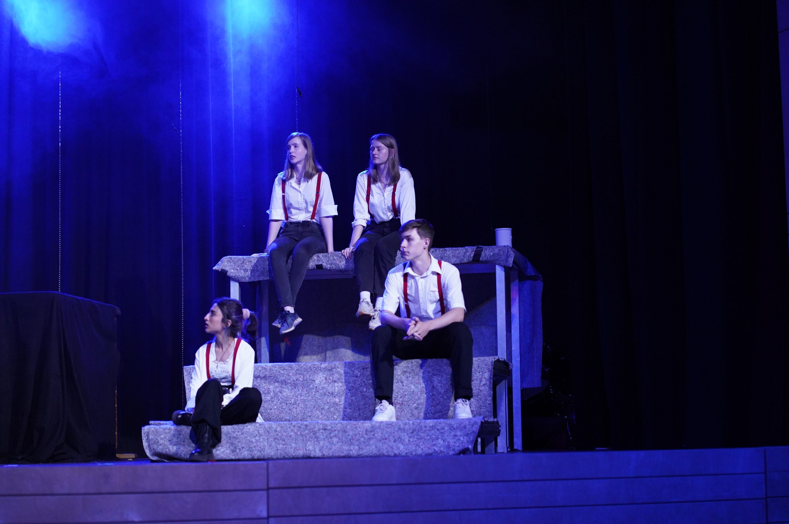 Nachfolgend ein paar Eindrücke der ersten Aufführung am Mittwoch.Fünf Personen auf einer Bühne in einem Theaterszenario, umgeben von blauen Lichtern. Eine Person trägt ein pinkes Outfit, während die anderen schwarze Kleidung tragen. Im Hintergrund steht eine Leiter und einige Requisiten sind sichtbar. Eine Bühnenaufführung mit mehreren Schauspielern. Im Vordergrund sitzt eine Person, während eine andere Person in einem pinken Shirt auf der Bühne nach links läuft. Im Hintergrund stehen drei weitere Schauspieler, die in weißen Hemden gekleidet sind. Die Bühne ist von bunten Lichtern beleuchtet, die eine dramatische Atmosphäre schaffen. Zwei Musiker auf einer Bühne in einem schwach beleuchteten Raum. Ein Mann spielt Klavier, während ein anderer Mann im Hintergrund E-Bass spielt. Beide tragen helle Kleidung. Ein Stuhl steht neben dem Klavier. Zwei Schauspieler auf einer Bühne in einem Theaterstück. Der erste Schauspieler trägt eine schwarze T-Shirt, rote Shorts und hat eine auffällige Frisur sowie Tierohren. Der zweite Schauspieler ist in einem schwarzen Outfit gekleidet und steht entspannt neben ihm. Im Hintergrund sind grüne Lichter und eine Kulisse mit einem steinernen Element zu sehen. Eine Absperrung aus roten und weißen Streifen ist ebenfalls im Bild. Eine Theateraufführung mit fünf Personen auf der Bühne. Zwei Darsteller tragen orangefarbene Tierkostüme, während die anderen in weißen Hemden mit roten Hosenträgern gekleidet sind. Die Szene spielt vor einem grünen Hintergrund mit Beleuchtungseffekten. Die Schauspieler interagieren miteinander, einige scheinen in ein Gespräch vertieft zu sein. Im Hintergrund sind Requisiten und ein Tisch zu sehen. Bühnenbild einer Theateraufführung mit zwei Schauspielerinnen, die auf einer erhöhten Plattform sitzen und ein Buch lesen, während ein weiterer Schauspieler im Vordergrund auf dem Boden liegt. Die Szenerie ist in blaues Licht getaucht. Vier junge Erwachsene sitzen auf einer steinernen Plattform auf einer Bühne, umgeben von blauen Lichtern. Zwei Personen sitzen oben, während zwei unten auf der Plattform platziert sind. Alle tragen ähnliche Kleidung, die aus weißen Hemden und schwarzen Hosen besteht. Die Szene vermittelt eine theatralische Atmosphäre. Zwei Personen auf einer Bühne in einem schwach beleuchteten Raum mit blauen Lichtern und Nebel. Eine Person trägt einen weißen Anzug und hält ein Kettensäge-ähnliches Gerät, während die andere Person in einem braunen Kostüm steht. Um sie herum sind Absperrbänder gespannt. Auf der Bühne stehen zwei Schauspieler. Der erste trägt ein braunes Tierkostüm und hat eine freundliche Ausstrahlung. Der zweite Schauspieler ist in einem pinken Outfit gekleidet. Sie stehen sich gegenüber, während Bühnenlichter und eine dunkle Kulisse mit Sternen im Hintergrund eine lebendige Atmosphäre schaffen. Zwei Schauspieler sitzen auf einer Bühne. Ein Darsteller trägt ein braunes Kostüm, das einem Tier ähnelt, während die andere Person in einem rosa Oberteil und schwarzen Leggings gekleidet ist. Im Hintergrund ist eine dunkle Bühnenkulisse mit blauen Lichtern und einer erhöhten Fläche zu sehen.