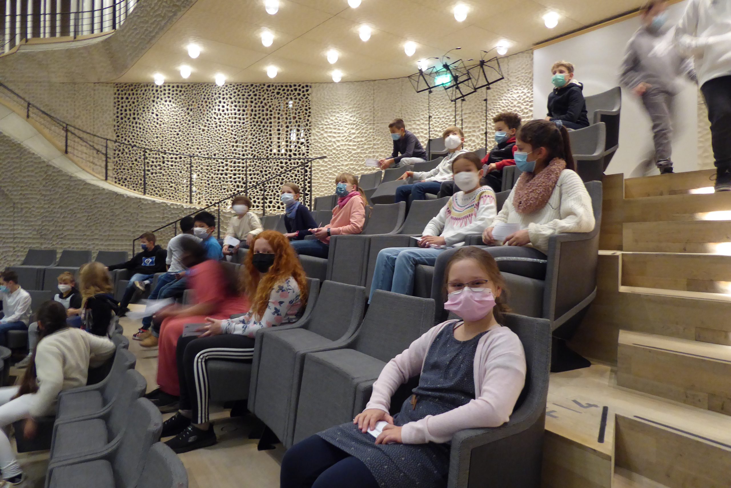 Diese Frage können unsere Fünft- und Sechstklässler beantworten. Denn am letzten Freitag (29. Oktober) machten sich insgesamt 12 Klassen mit ihren Lehrerinnen und Lehrern auf den Weg in die Elbphilharmonie. 360 Sitze von den 1000 zugelassenen Plätzen des Großen Saals waren für das Gymnasium Rahlstedt reserviert. Der Titel des Konzerts lautete: „Rune Thorsteinsson Patchwork“. Das Trio hatte es sich zur Aufgabe gemacht, alle erdenklichen Gegenstände zum Leben zu erwecken. Die Schlagzeuger brachten nicht nur herkömmliche Instrumente, wie die Klarinette und den Flügel zum Klingen, sie schafften es auch, eher unkonventionellen Gegenständen, wie einem Schneebesen oder einer Schüssel mit Wasser Töne zu entlocken. Die extra für diese Veranstaltung komponierten Stücke sahen vielfach eine Begleitung durch das Publikum vor. Die Neun- bis Elfjährigen waren dazu aufgefordert mitzuklatschen, Wirbel zu erzeugen und einen Hintergrund-Summ-Chor zu imitieren.