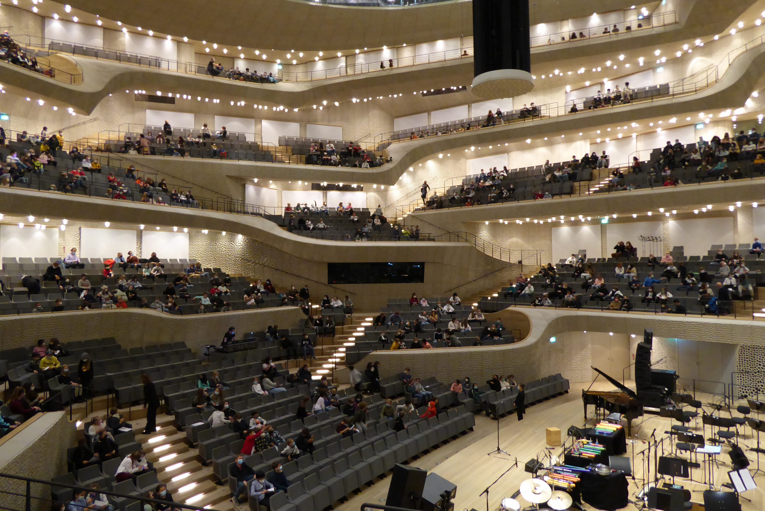 Diese Frage können unsere Fünft- und Sechstklässler beantworten. Denn am letzten Freitag (29. Oktober) machten sich insgesamt 12 Klassen mit ihren Lehrerinnen und Lehrern auf den Weg in die Elbphilharmonie. 360 Sitze von den 1000 zugelassenen Plätzen des Großen Saals waren für das Gymnasium Rahlstedt reserviert. Der Titel des Konzerts lautete: „Rune Thorsteinsson Patchwork“. Das Trio hatte es sich zur Aufgabe gemacht, alle erdenklichen Gegenstände zum Leben zu erwecken. Die Schlagzeuger brachten nicht nur herkömmliche Instrumente, wie die Klarinette und den Flügel zum Klingen, sie schafften es auch, eher unkonventionellen Gegenständen, wie einem Schneebesen oder einer Schüssel mit Wasser Töne zu entlocken. Die extra für diese Veranstaltung komponierten Stücke sahen vielfach eine Begleitung durch das Publikum vor. Die Neun- bis Elfjährigen waren dazu aufgefordert mitzuklatschen, Wirbel zu erzeugen und einen Hintergrund-Summ-Chor zu imitieren.