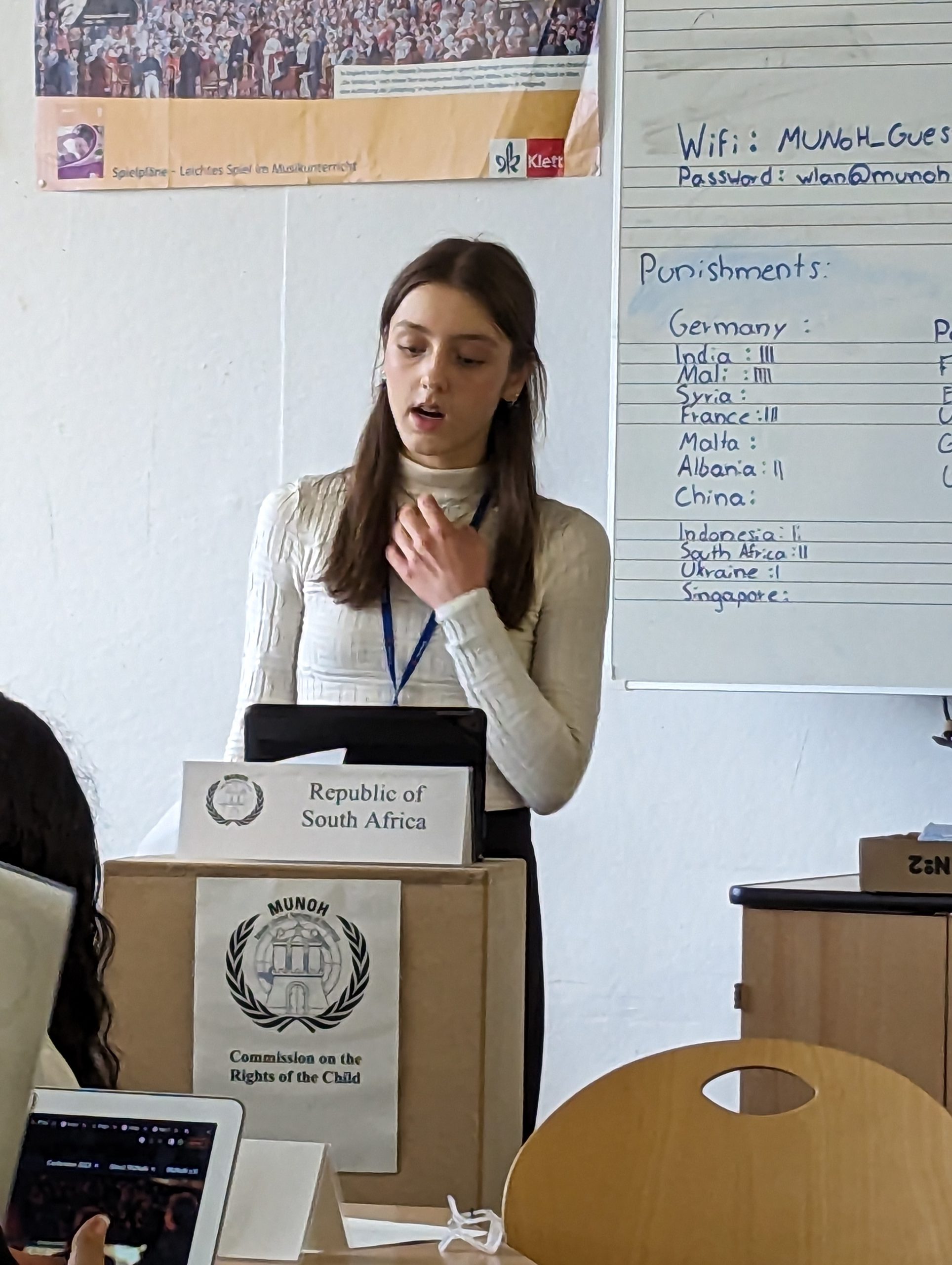 This year’s conference was opened at the Mozartsäle and once more pupils from different schools from all over Germany and abroad (e.g. Israel, Italy and Cyprus) attended. With 35 people, the GyRa delegation was the largest and consisted of: 26 delegates representing a country, seven (!) chairs who were in charge of leading their committees, and two MUN directors. This time, we again represented some really interesting nations: The French Republic (one of the big 5!), The Islamic Republic of Iran, the Republic of South Africa, the Republic of Indonesia and the United Arab Emirates. After the grand opening on Wednesday, our GyRa delegates had to work hard until Sunday to join together and discuss current issues of global importance and – just like the real UN – come up with their own effective solutions. Some of the hottest topics being discussed were: