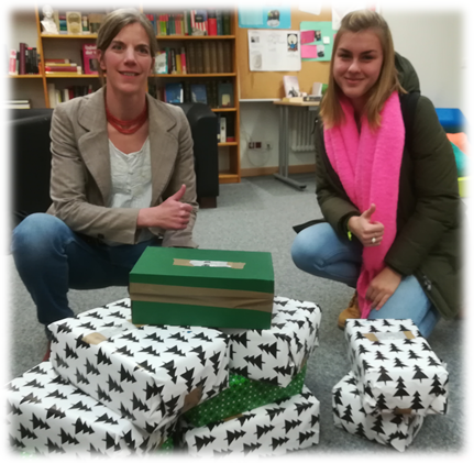 Zwei Frauen posieren fröhlich vor einer Ansammlung von liebevoll verpackten Geschenken. Die Frau links trägt eine graue Jacke und hat die Haare zu einem Pferdeschwanz gebunden. Die Frau rechts trägt einen grünen Parka und einen pinken Schal. Beide zeigen Daumen nach oben und lächeln. Im Hintergrund sind Bücherregale und ein Tisch sichtbar.