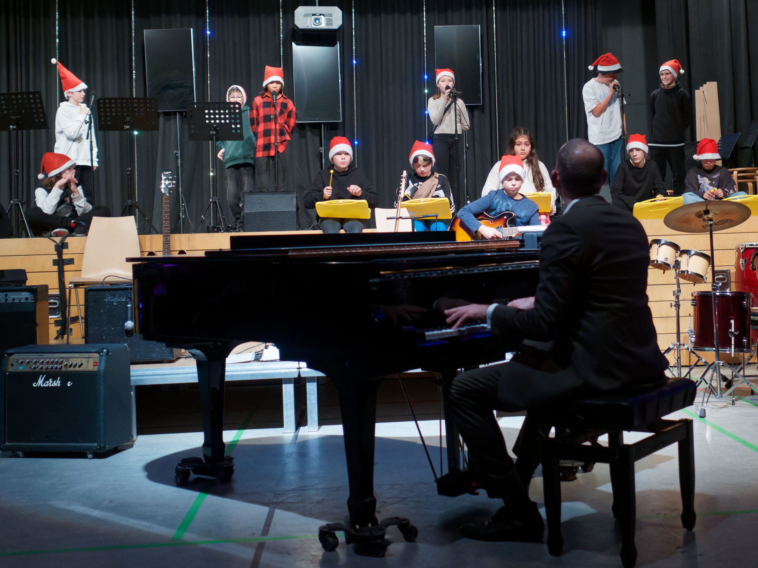 Eine große Gruppe von Menschen steht auf einer Bühne und singt. Sie tragen verschiedene Kleidungsstücke, darunter einige mit festlichen Hüten. Im Vordergrund sind Musikinstrumente wie Gitarren und Schlagzeuge zu sehen. Eine Person filmt die Aufführung mit einem Smartphone. Die Bühne ist schwach beleuchtet, und im Hintergrund sieht man eine technische Ausstattung. Eine Gruppe von Schülerinnen und Schülern steht auf einer Bühne. Sie tragen verschiedene Outfits, darunter einige festliche Kleidungsstücke. Im Hintergrund sind Lichter und Dekorationen zu sehen. Vor der Bühne stehen Musikinstrumente, darunter ein Schlagzeug. Die Atmosphäre wirkt festlich und lebhaft. Ein Musiker spielt Schlagzeug auf einer Bühne, während ein weiterer Musiker an einem Klavier sitzt. Im Vordergrund sind einige Zuschauer sichtbar, die in festlicher Kleidung mit Weihnachtsmützen sitzen und auf die Darbietung schauen. Der Hintergrund ist mit Dekorationen geschmückt, die eine festliche Atmosphäre schaffen. Eine Band spielt auf einer Bühne. Im Vordergrund sind ein Schlagzeuger und ein Pianist zu sehen, während eine Sängerin und eine Gitarristin im Hintergrund auftreten. Die Bühne ist beleuchtet, und im Publikum sind einige Zuschauer zu erkennen, die das Konzert genießen. Drei Musiker auf einer Bühne während einer Aufführung. Links steht ein Mann mit Notenständer und Mikrofon, in der Mitte eine Frau, die singt, und rechts eine Frau mit E-Gitarre. Die Bühne ist mit bunten Lichtern und Lautsprechern dekoriert. Im Vordergrund sind Gitarren sichtbar. Eine Sängerin steht auf einer Bühne und singt, während eine andere Person im Vordergrund E-Gitarre spielt. Im Hintergrund sind Lautsprecher und weitere Musikinstrumente sichtbar. Die Bühne ist mit einem schwarzen Vorhang dekoriert. Eine Gruppe von Tänzerinnen in weißen Oberteilen und karierten Hosen führt eine Choreografie auf einer Bühne auf. Im Vordergrund sind einige Zuschauer zu sehen. Die Bühne ist mit Musikinstrumenten und Technik ausgestattet. Zwei junge Erwachsene stehen auf einer Bühne. Der Mann trägt einen Anzug und hat eine lässige Haltung, während die Frau in einem schwarzen Outfit steht und ein Mikrofon hält. Im Hintergrund sind Vorhänge und eine Holzwand, die dekorative Elemente zeigt. Es ist eine Bühnenaufführung oder Veranstaltung. Eine Gruppe von Kindern steht auf einer Bühne und singt, während ein junger Musiker am Klavier spielt. Im Hintergrund sind bunte Lichter sichtbar. Die Bühne hat eine Holzoptik und es sind weitere Musikinstrumente zu sehen. Vier Mädchen in lässigen Outfits stehen auf einer Bühne und führen eine Darbietung auf. Sie tragen weiße Oberteile und gemusterte Hosen. Im Hintergrund sind farbige Lichter und ein dunkler Vorhang zu sehen. Eine große Gruppe von Musikern steht auf einer Bühne und spielt gemeinsam. Die Bühne ist mit roten Lichtern und dekorativen Elementen geschmückt. Im Vordergrund sind einige Stühle und Instrumente sichtbar. Die Musiker tragen einheitliche T-Shirts und scheinen sich auf das Konzert zu konzentrieren. Eine Vielzahl von Kindern steht auf einer Bühne und spielt Geigen und Celli. Ein Dirigent leitet die Gruppe. Im Hintergrund sind rote Lichter und eine dunkle Bühnenkulisse zu sehen. Auf der linken Seite sitzt ein Pianist. Die Szene vermittelt eine festliche Atmosphäre eines Konzerts. Eine Gruppe von Musikern, darunter Kinder und Jugendliche, steht auf einer Bühne und spielt ein Konzert. Der Dirigent, der sich im Vordergrund befindet, leitet das Ensemble. Im Hintergrund sind rote Lichtakzente und verschiedene Musikinstrumente zu sehen, die auf der Bühne platziert sind. Die Musiker tragen überwiegend weiße Hemden und viele haben rote Accessoires. Die Szene vermittelt eine festliche Atmosphäre. Ein Musiker sitzt an einem Klavier und spielt, während im Hintergrund eine Gruppe von Kindern in Weihnachtsmützen auf einer Bühne steht. Einige Kinder halten Musikinstrumente, während andere singen. Im Vordergrund sind Musikgeräte wie Verstärker zu sehen, und die Bühne ist festlich dekoriert. Eine Gruppe von sechs Frauen steht auf einer Bühne, während ein Mann an einem Pult spricht. Die Frauen tragen unterschiedliche, helle Kleidung und stehen in einer Reihe. Im Hintergrund sind Lichter in verschiedenen Farben zu sehen, die die Bühne beleuchten. Vor der Bühne sind Musikinstrumente und Lautsprecher sichtbar. Eine Gruppe von acht Jugendlichen steht auf einer Bühne und singt. Sie tragen Weihnachtsmützen und verschiedene Kleidung. Im Hintergrund sind Lautsprecher und ein Projektor sichtbar. Vor der Gruppe stehen Notenständer. Der Bühnenboden ist aus Holz, und im Vordergrund sind einige Musikinstrumente zu sehen. Eine Gruppe von Kindern und Jugendlichen steht auf einer Bühne in einem Veranstaltungsraum. Sie halten Instrumente und stehen in einer Reihe, während ein Erwachsener links im Bild steht. Im Hintergrund sind Musikinstrumente wie Gitarren und Schlagzeuge sichtbar. Die Bühne ist mit Vorhängen und Beleuchtung ausgestattet. Eine Gruppe von Kindern und Jugendlichen singt auf einer Bühne. Einige tragen Weihnachtsmützen, darunter eine in Rot und eine in Weiß. Im Hintergrund sind weitere Personen sichtbar, die ebenfalls an der Aufführung teilnehmen. Die Atmosphäre wirkt festlich und lebhaft.