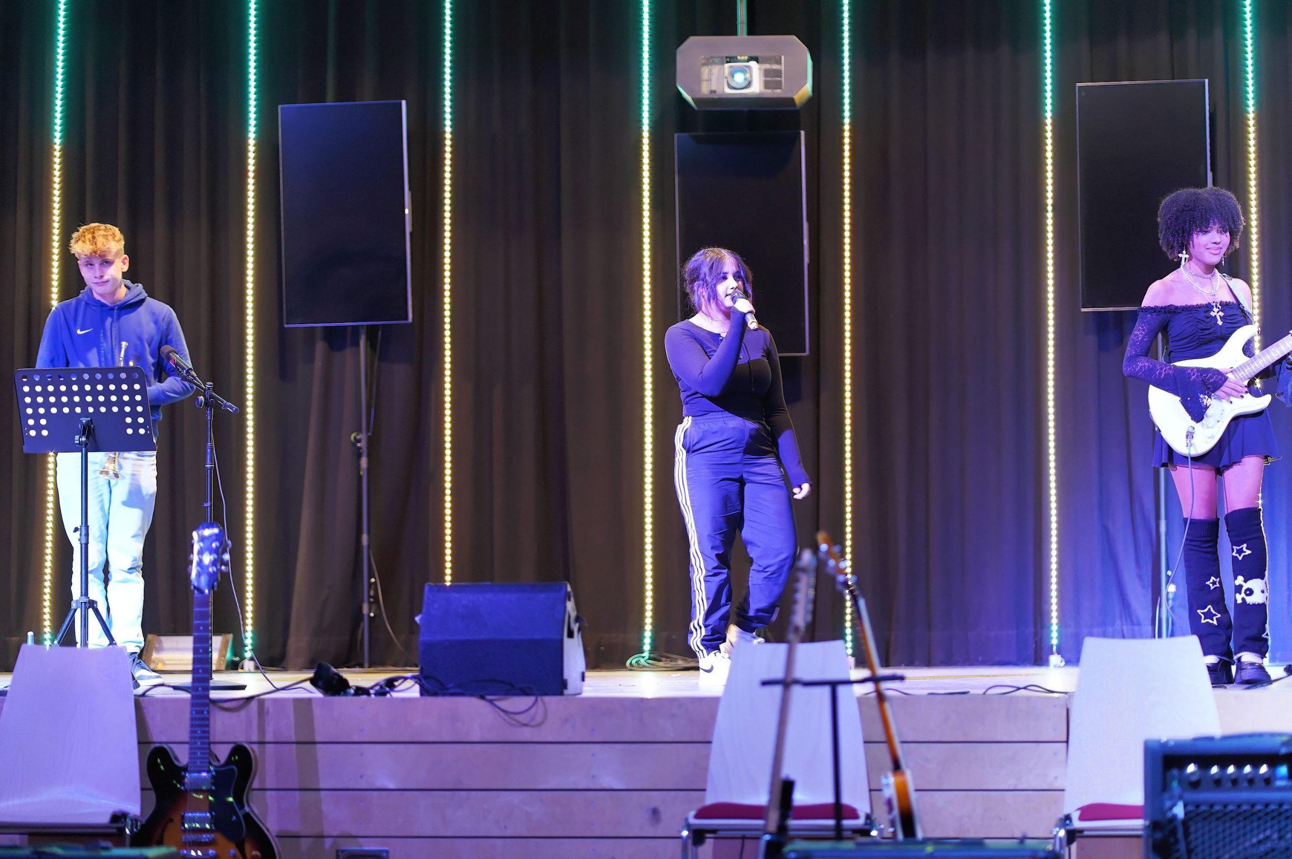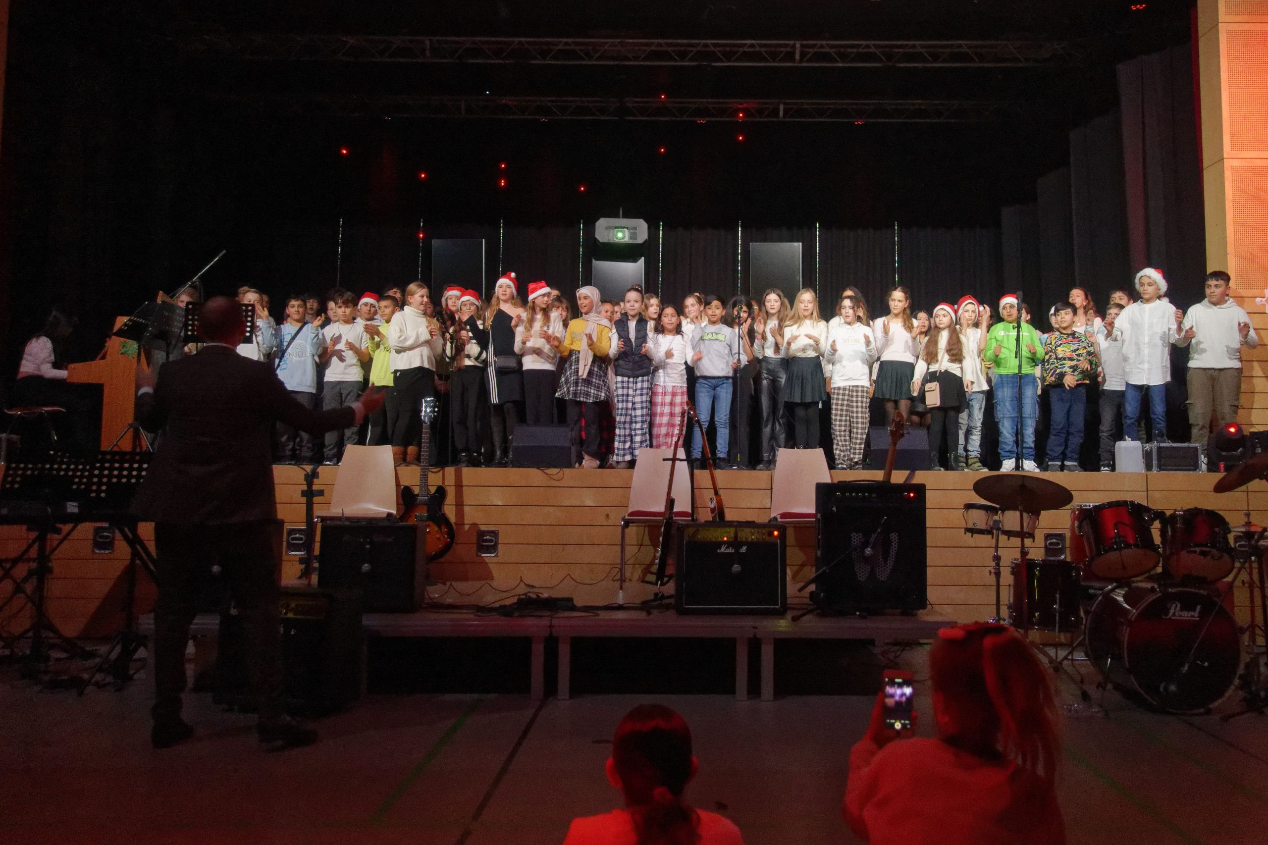Eine große Gruppe von Menschen steht auf einer Bühne und singt. Sie tragen verschiedene Kleidungsstücke, darunter einige mit festlichen Hüten. Im Vordergrund sind Musikinstrumente wie Gitarren und Schlagzeuge zu sehen. Eine Person filmt die Aufführung mit einem Smartphone. Die Bühne ist schwach beleuchtet, und im Hintergrund sieht man eine technische Ausstattung. Eine Gruppe von Schülerinnen und Schülern steht auf einer Bühne. Sie tragen verschiedene Outfits, darunter einige festliche Kleidungsstücke. Im Hintergrund sind Lichter und Dekorationen zu sehen. Vor der Bühne stehen Musikinstrumente, darunter ein Schlagzeug. Die Atmosphäre wirkt festlich und lebhaft. Ein Musiker spielt Schlagzeug auf einer Bühne, während ein weiterer Musiker an einem Klavier sitzt. Im Vordergrund sind einige Zuschauer sichtbar, die in festlicher Kleidung mit Weihnachtsmützen sitzen und auf die Darbietung schauen. Der Hintergrund ist mit Dekorationen geschmückt, die eine festliche Atmosphäre schaffen. Eine Band spielt auf einer Bühne. Im Vordergrund sind ein Schlagzeuger und ein Pianist zu sehen, während eine Sängerin und eine Gitarristin im Hintergrund auftreten. Die Bühne ist beleuchtet, und im Publikum sind einige Zuschauer zu erkennen, die das Konzert genießen. Drei Musiker auf einer Bühne während einer Aufführung. Links steht ein Mann mit Notenständer und Mikrofon, in der Mitte eine Frau, die singt, und rechts eine Frau mit E-Gitarre. Die Bühne ist mit bunten Lichtern und Lautsprechern dekoriert. Im Vordergrund sind Gitarren sichtbar. Eine Sängerin steht auf einer Bühne und singt, während eine andere Person im Vordergrund E-Gitarre spielt. Im Hintergrund sind Lautsprecher und weitere Musikinstrumente sichtbar. Die Bühne ist mit einem schwarzen Vorhang dekoriert. Eine Gruppe von Tänzerinnen in weißen Oberteilen und karierten Hosen führt eine Choreografie auf einer Bühne auf. Im Vordergrund sind einige Zuschauer zu sehen. Die Bühne ist mit Musikinstrumenten und Technik ausgestattet. Zwei junge Erwachsene stehen auf einer Bühne. Der Mann trägt einen Anzug und hat eine lässige Haltung, während die Frau in einem schwarzen Outfit steht und ein Mikrofon hält. Im Hintergrund sind Vorhänge und eine Holzwand, die dekorative Elemente zeigt. Es ist eine Bühnenaufführung oder Veranstaltung. Eine Gruppe von Kindern steht auf einer Bühne und singt, während ein junger Musiker am Klavier spielt. Im Hintergrund sind bunte Lichter sichtbar. Die Bühne hat eine Holzoptik und es sind weitere Musikinstrumente zu sehen. Vier Mädchen in lässigen Outfits stehen auf einer Bühne und führen eine Darbietung auf. Sie tragen weiße Oberteile und gemusterte Hosen. Im Hintergrund sind farbige Lichter und ein dunkler Vorhang zu sehen. Eine große Gruppe von Musikern steht auf einer Bühne und spielt gemeinsam. Die Bühne ist mit roten Lichtern und dekorativen Elementen geschmückt. Im Vordergrund sind einige Stühle und Instrumente sichtbar. Die Musiker tragen einheitliche T-Shirts und scheinen sich auf das Konzert zu konzentrieren. Eine Vielzahl von Kindern steht auf einer Bühne und spielt Geigen und Celli. Ein Dirigent leitet die Gruppe. Im Hintergrund sind rote Lichter und eine dunkle Bühnenkulisse zu sehen. Auf der linken Seite sitzt ein Pianist. Die Szene vermittelt eine festliche Atmosphäre eines Konzerts. Eine Gruppe von Musikern, darunter Kinder und Jugendliche, steht auf einer Bühne und spielt ein Konzert. Der Dirigent, der sich im Vordergrund befindet, leitet das Ensemble. Im Hintergrund sind rote Lichtakzente und verschiedene Musikinstrumente zu sehen, die auf der Bühne platziert sind. Die Musiker tragen überwiegend weiße Hemden und viele haben rote Accessoires. Die Szene vermittelt eine festliche Atmosphäre. Ein Musiker sitzt an einem Klavier und spielt, während im Hintergrund eine Gruppe von Kindern in Weihnachtsmützen auf einer Bühne steht. Einige Kinder halten Musikinstrumente, während andere singen. Im Vordergrund sind Musikgeräte wie Verstärker zu sehen, und die Bühne ist festlich dekoriert. Eine Gruppe von sechs Frauen steht auf einer Bühne, während ein Mann an einem Pult spricht. Die Frauen tragen unterschiedliche, helle Kleidung und stehen in einer Reihe. Im Hintergrund sind Lichter in verschiedenen Farben zu sehen, die die Bühne beleuchten. Vor der Bühne sind Musikinstrumente und Lautsprecher sichtbar. Eine Gruppe von acht Jugendlichen steht auf einer Bühne und singt. Sie tragen Weihnachtsmützen und verschiedene Kleidung. Im Hintergrund sind Lautsprecher und ein Projektor sichtbar. Vor der Gruppe stehen Notenständer. Der Bühnenboden ist aus Holz, und im Vordergrund sind einige Musikinstrumente zu sehen. Eine Gruppe von Kindern und Jugendlichen steht auf einer Bühne in einem Veranstaltungsraum. Sie halten Instrumente und stehen in einer Reihe, während ein Erwachsener links im Bild steht. Im Hintergrund sind Musikinstrumente wie Gitarren und Schlagzeuge sichtbar. Die Bühne ist mit Vorhängen und Beleuchtung ausgestattet. Eine Gruppe von Kindern und Jugendlichen singt auf einer Bühne. Einige tragen Weihnachtsmützen, darunter eine in Rot und eine in Weiß. Im Hintergrund sind weitere Personen sichtbar, die ebenfalls an der Aufführung teilnehmen. Die Atmosphäre wirkt festlich und lebhaft.