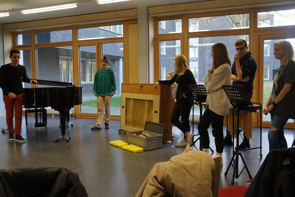Die Oberstufenkurse Musik improvisierten gemeinsam. Auf dem Harmonieschema von Autumn Leaves, basierend auf G Major musizierten die Kursteilnehmer beider Kurse gemeinsam. Spannend zu beobachten, wie sich alle vom Gelernten entfernten, um gemeinsam neue Linien zu entdecken, und improvisatorisch auszuarbeiten. Es machte viel Spaß zuzuhören, da das gemeinsame Erleben der neu entdeckten Linien im Vordergrund stand. Am Ende kamen alle zum gemeinsamen Musizieren und hatten viel Freude.