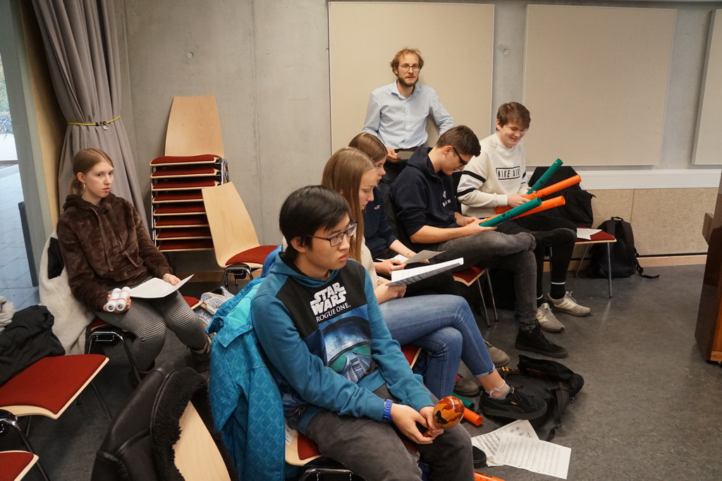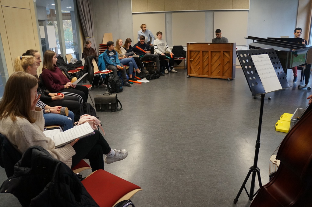 Die Oberstufenkurse Musik improvisierten gemeinsam. Auf dem Harmonieschema von Autumn Leaves, basierend auf G Major musizierten die Kursteilnehmer beider Kurse gemeinsam. Spannend zu beobachten, wie sich alle vom Gelernten entfernten, um gemeinsam neue Linien zu entdecken, und improvisatorisch auszuarbeiten. Es machte viel Spaß zuzuhören, da das gemeinsame Erleben der neu entdeckten Linien im Vordergrund stand. Am Ende kamen alle zum gemeinsamen Musizieren und hatten viel Freude.