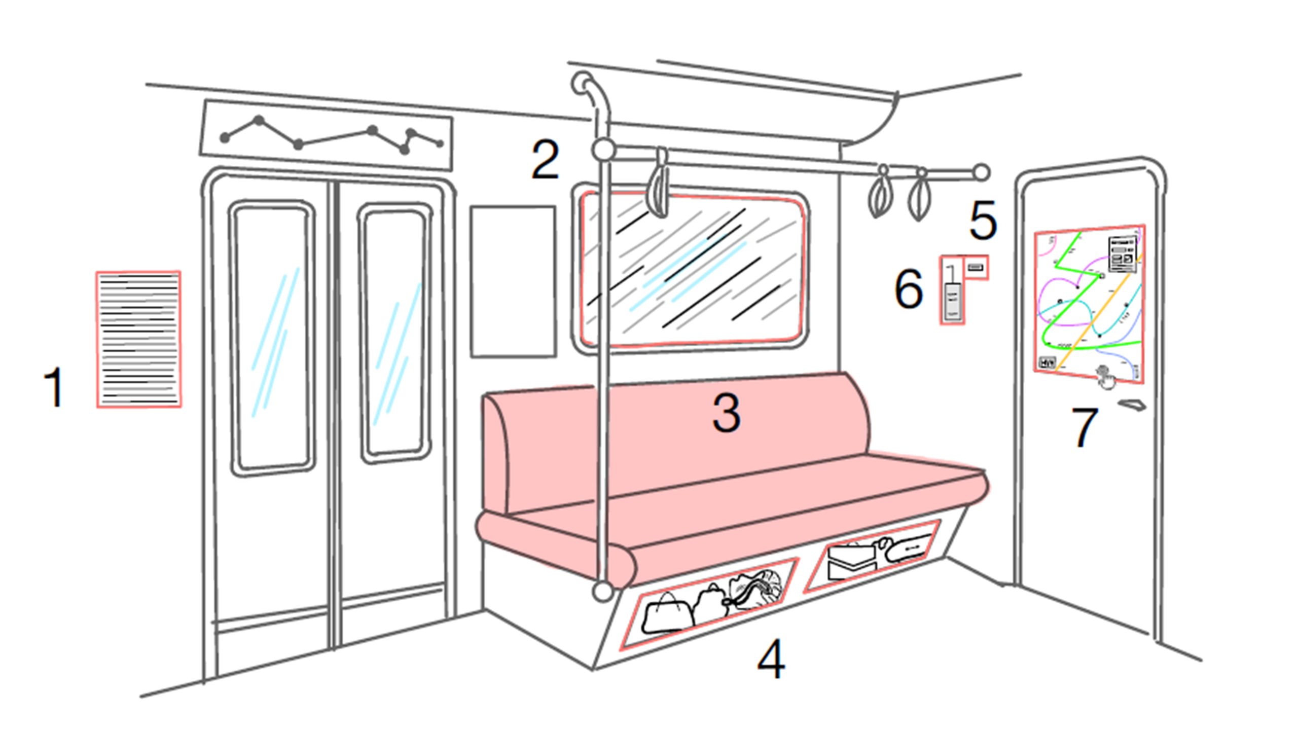 Das Bild zeigt mehrere Ansichten eines modernen Gartenhauses oder Pavillons. Es gibt eine Innenansicht mit einer L-förmigen Bank, Pflanzen und Fenstern, die viel Licht hereinlassen. Weitere Perspektiven zeigen die Struktur von außen und die Anordnung der Möbel sowie die Verwendung von Holz und Pflanzen für eine ansprechende Gestaltung. Die Bilder vermitteln eine harmonische Verbindung zwischen Innenraum und Natur. Illustration einer Bus- und Haltestelle mit verschiedenen Elementen für Barrierefreiheit. Auf der linken Seite sind ein Wartebereich, Informationsschilder, ein Fahrkartenautomat und eine Pflanze dargestellt. Auf der rechten Seite sind ein überdachter Bereich, ein weiterer Fahrkartenautomat und Abstellmöglichkeiten für Fahrräder zu sehen. Es sind auch Symbole für barrierefreie Zugänge und Hilfsmittel abgebildet, die die Nutzung für Personen mit Mobilitätseinschränkungen erleichtern. Illustration des Innenraums einer U-Bahn: links befindet sich eine Wand mit einer Informationsanzeige (1), gefolgt von zwei Glastüren (2). In der Mitte ist eine gepolsterte Bank (3) mit Stauraum darunter (4). An der Decke hängen Haltestangen (5). Rechts ist eine Tür (6) und ein Informationsschild mit einer Stadtkarte (7) zu sehen.