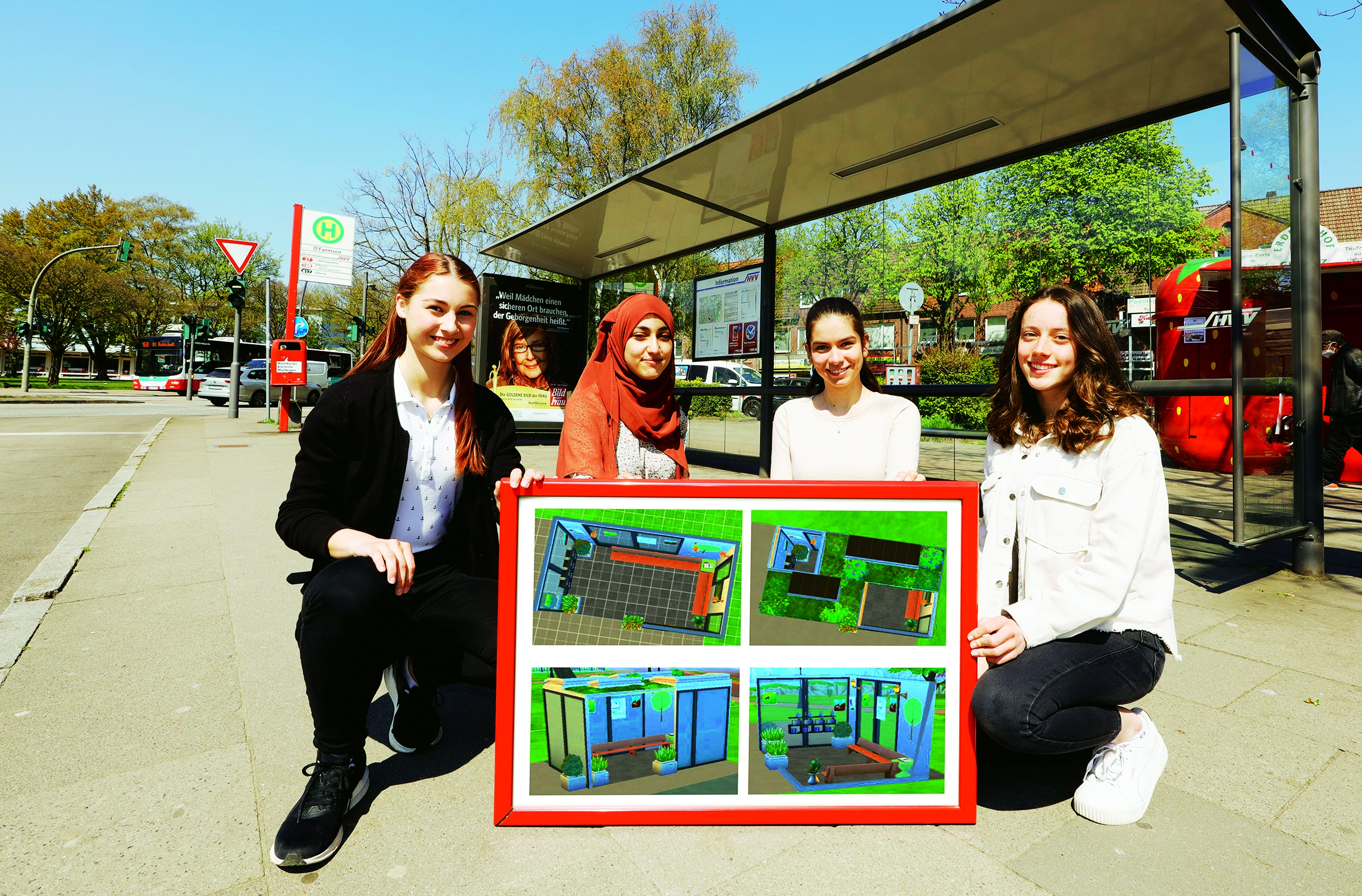 Vier Frauen sitzen auf dem Boden an einer Haltestelle und halten ein großes Plakat mit farbigen Zeichnungen von modernen Buswartehäuschen. Im Hintergrund sind Bäume und ein Bus zu sehen.